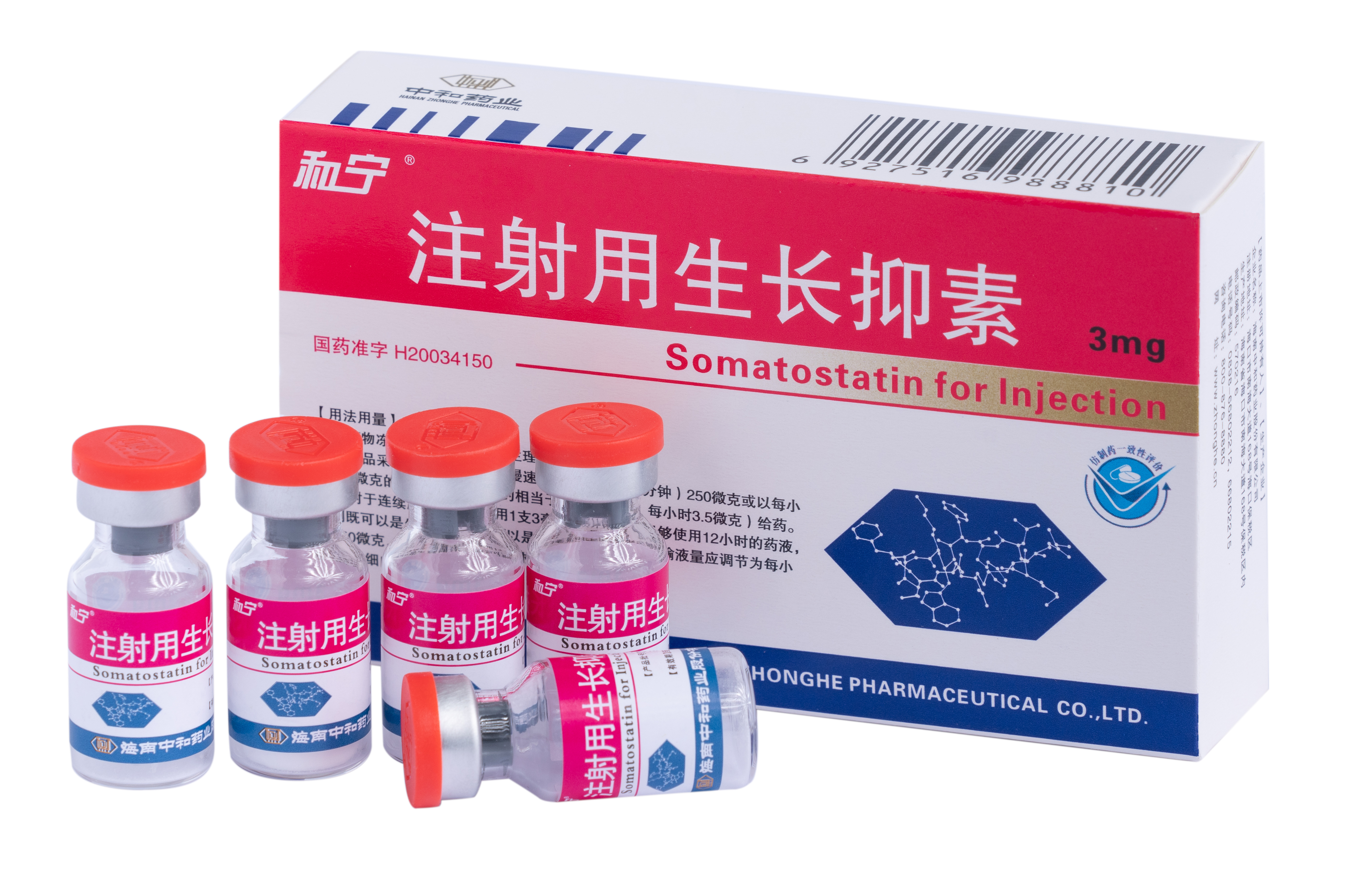 生長(zhǎng)抑素是人工合成的環(huán)狀十四氨基酸肽,其與天然生長(zhǎng)抑素在化學(xué)結(jié)構(gòu)和作用機(jī)理上完全相同。