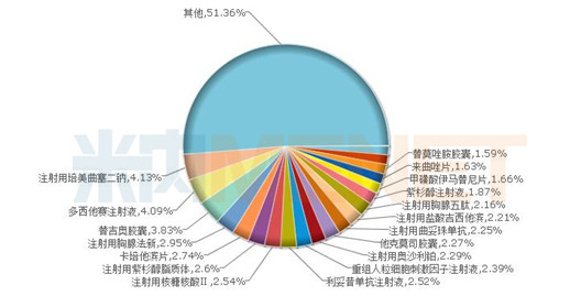 截至目前,申報(bào)一致性評價(jià)的抗腫瘤產(chǎn)品在2017年中國公立醫(yī)療機(jī)構(gòu)終端抗腫瘤和免疫調(diào)節(jié)劑的競爭格局中均處于主導(dǎo)地位,注射用培美曲塞二鈉以4.13%的比例位居首位,多西他賽注射液以4.09%的比例緊接其后,注射用胸腺法新以2.95%的比例排位第四。
