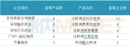 表2:注射劑一致性評價(jià)參比制劑備案企業(yè)及產(chǎn)品TOP5