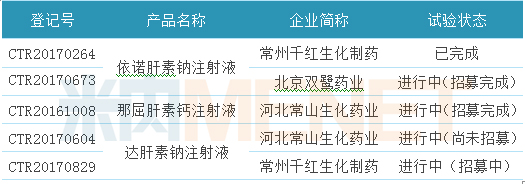 截至目前,一致性評價(jià)中準(zhǔn)備開展/已開展/已完成BE試驗(yàn)的注射劑有5個(gè)登記號,涉及企業(yè)3家,品種3個(gè)。從進(jìn)行試驗(yàn)的企業(yè)看,常州千紅生化藥業(yè)、河北常山生化藥業(yè)均有2個(gè)產(chǎn)品處于試驗(yàn)階段;從試驗(yàn)的產(chǎn)品看,有2家藥企進(jìn)行BE試驗(yàn)的依諾肝素鈉注射液,深圳市天道醫(yī)藥已搶先一步,其產(chǎn)品已經(jīng)處于申報(bào)一致性評價(jià)的隊(duì)列。