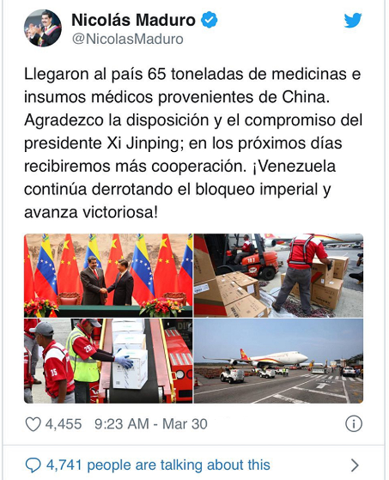 委內瑞拉外長阿雷亞薩、衛(wèi)生部長阿爾瓦拉多、經濟和財政部長塞爾帕以及中國駐委大使李寶榮等到機場迎接。委內瑞拉總統(tǒng)馬杜羅在電視講話中和個人推特賬號上表示“這是真正的人道主義援助,感謝中國政府和人民對委人民的支持?!?/span>
