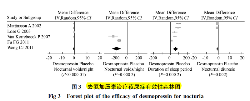 5 個用于Meta 分析的RCT包含619 例患者( 去氨加壓素治療組317 例,對照組302 例) 。采用卡方檢驗對各項獨立研究的效應值進行異質性檢驗( 檢驗標準為P < 0. 1) ,異質性是存在的,因而采用隨機效應模型。結果顯示,去氨加壓素能夠有效減少或減輕夜尿次數(shù)、夜尿量、夜間多尿情況( 分別為P < 0. 00001、P = 0. 000 3、P = 0. 002) ,并且去氨加壓素組患者入睡至第1 次起床排尿的時間也明顯延長( P = 0. 00002) 。