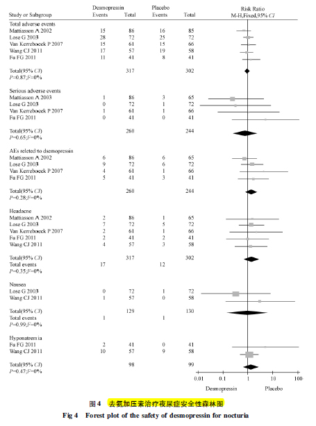 5 個納入Meta 分析的RCT 顯示,去氨加壓素組和對照劑組產生的總的不良反應次數(shù)和嚴重不良反應的次數(shù)比較,差異無統(tǒng)計學意義( 分別為P = 0. 87、P = 0. 65) 。涉及最常見的不良反應如頭痛、惡心、低血鈉等,2組比較,差異也無統(tǒng)計學意義( 分別為P = 0. 36、P = 0. 99、P = 0. 47)。