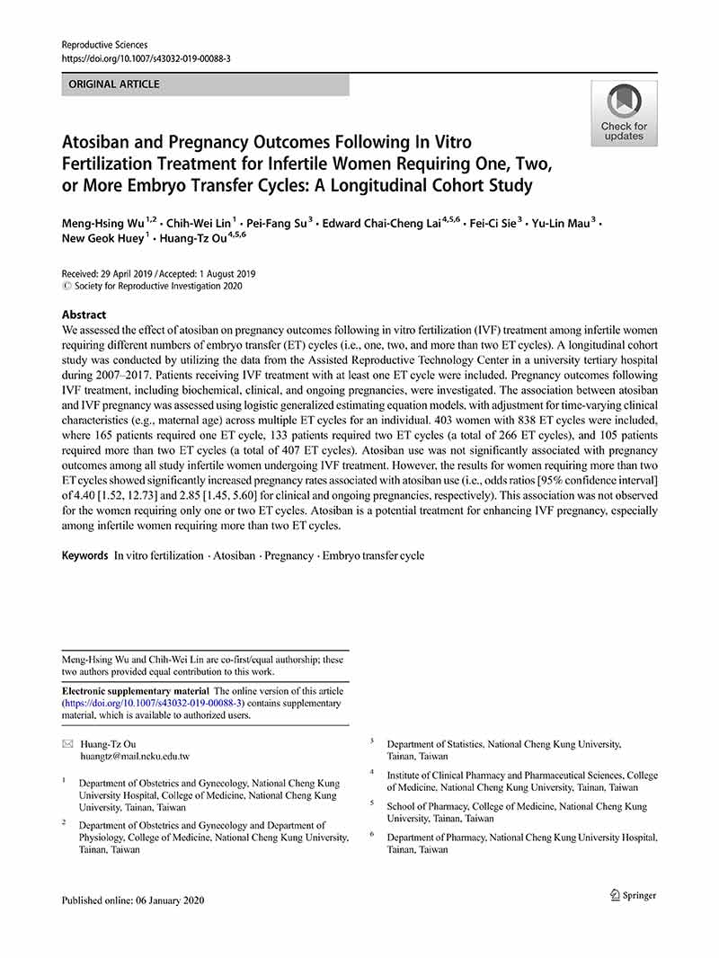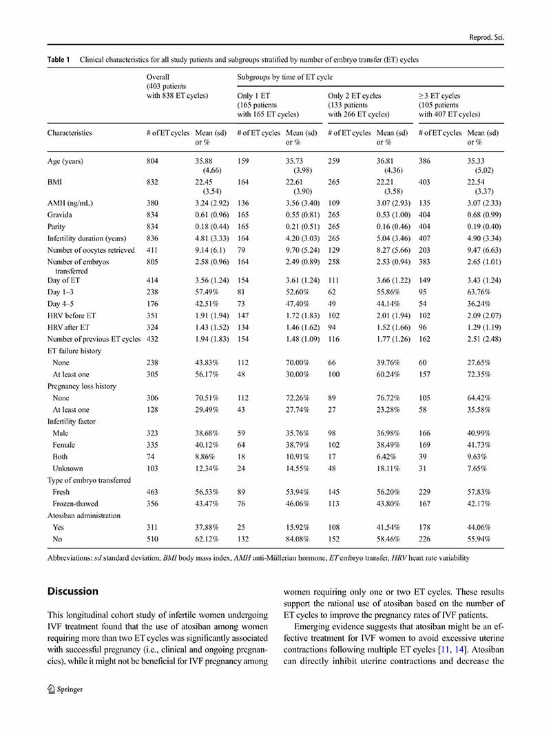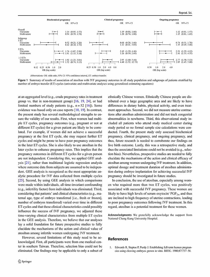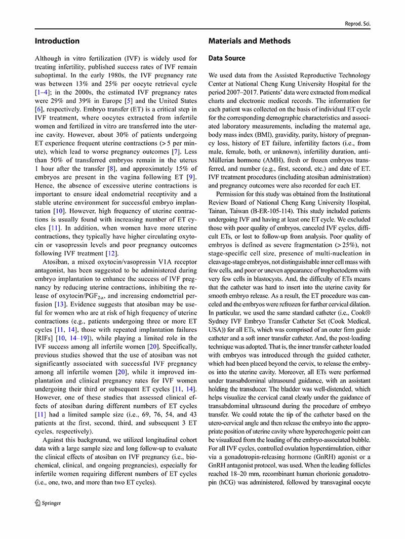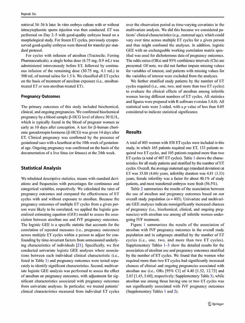 一項縱向隊列研究:阿托西班用于單個、兩個或多個胚胎移植周期的患者體外受精后的妊娠結(jié)局