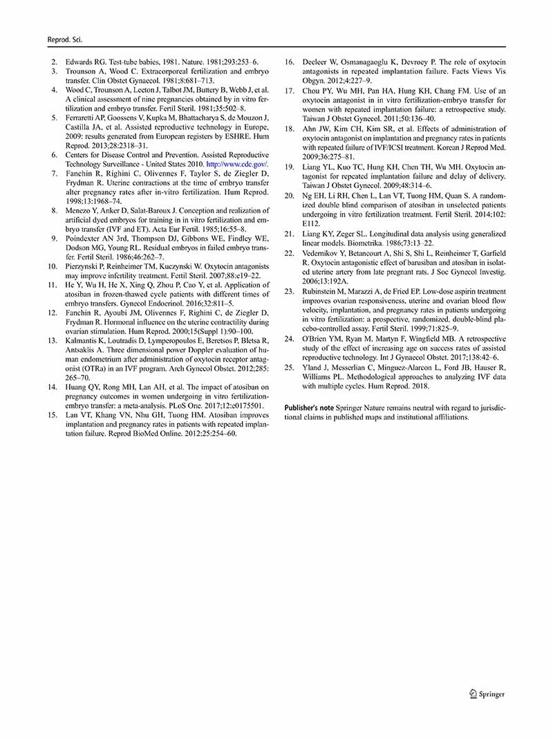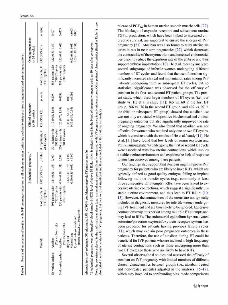 結(jié)論:注射阿托西班是一種潛在的提高體外受精妊娠率的治療方法,特別是在需要兩個以上胚胎移植周期的不孕婦女中。
