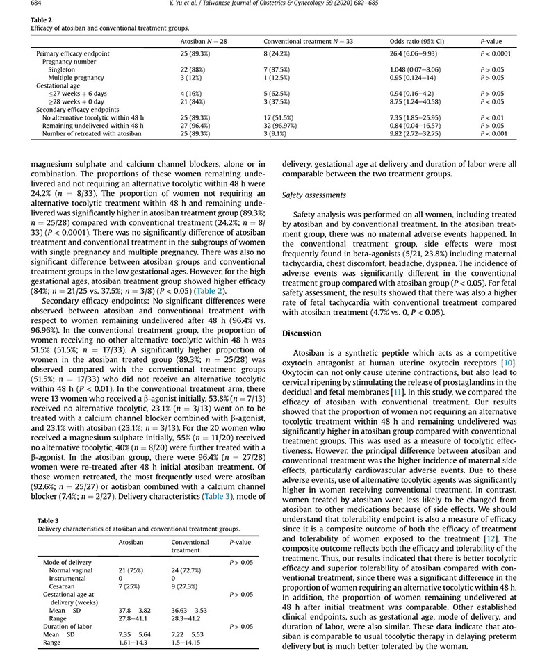 材料與方法:收集2017年1月1日至12月31日期間所有接受阿托西班治療的先兆早產(chǎn)孕婦資料,以常規(guī)治療(包括β-受體激動劑、吲哚美辛、硫酸鎂和鈣通道阻滯劑,單用或聯(lián)合應(yīng)用)的孕婦作為對照。