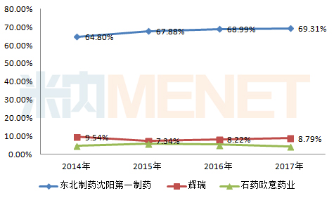 從2017年的數(shù)據(jù)看,東北制藥以69.31%的市場份額位居首位,原研廠家輝瑞以8.79%的比例緊接其后。從近幾年各大品牌的市場份額變化看,東北制藥基本呈現(xiàn)穩(wěn)定增長的態(tài)勢,輝瑞的市場份額則有所波動(dòng)。